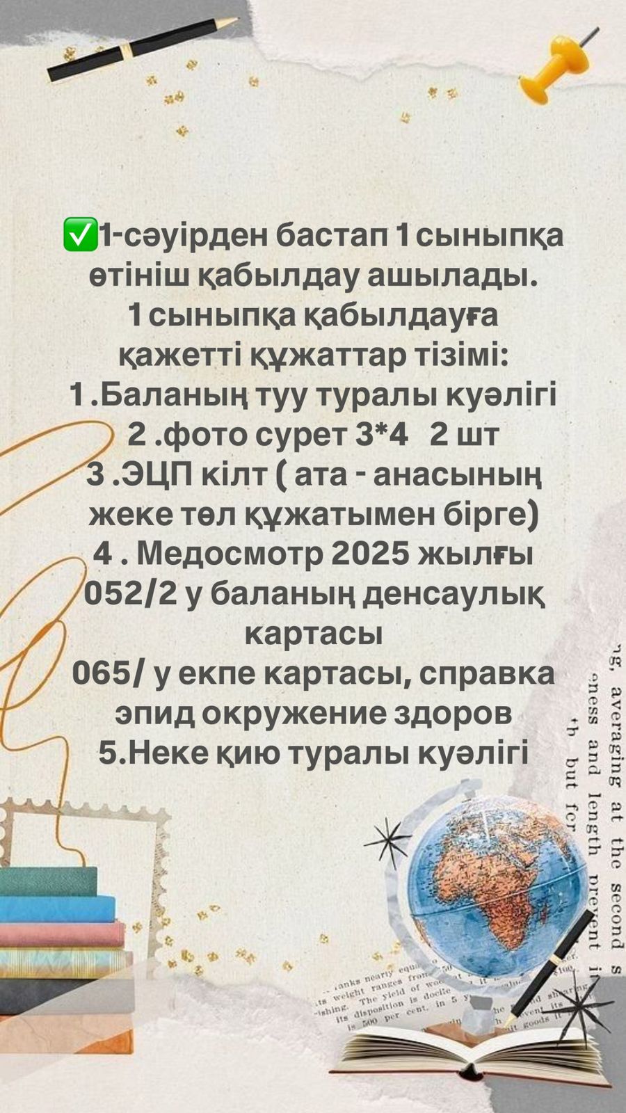2025-2026 оқу жылының 1-сыныбына оқушыларды қабылдау басталатынын хабарлаймыз.